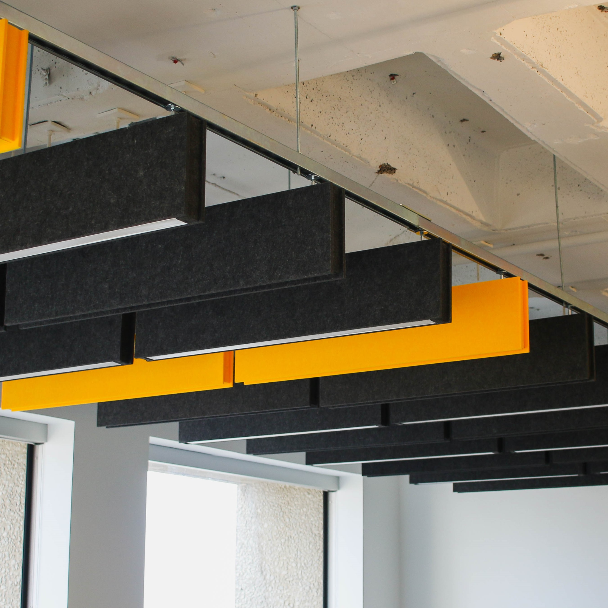 Fabric Sound Baffles reduce noise in high humidity manufacturing spaces where suspended ceilings are challenging to install. They can be made with decorative fabrics for both indoor and outdoor use.